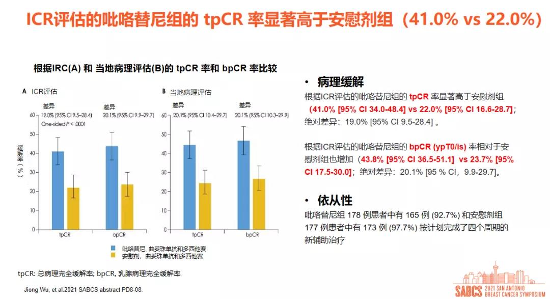 至数据截止日期2021年4月30日,独立评审委员会(IRC)评估的吡咯替尼组tpCR(ypT0/is,ypN0)率相较安慰剂组显著提高19%(41.0% vs 22.0%,P<0.001),bpCR(ypT0/is)率提高20.1%(43.8% vs 23.7%)。当地病理学家评估的tpCR率则分别为44.4%和24.3%。新辅助治疗后吡咯替尼组和安慰剂组的ORR分别为91.6%和81.9%。