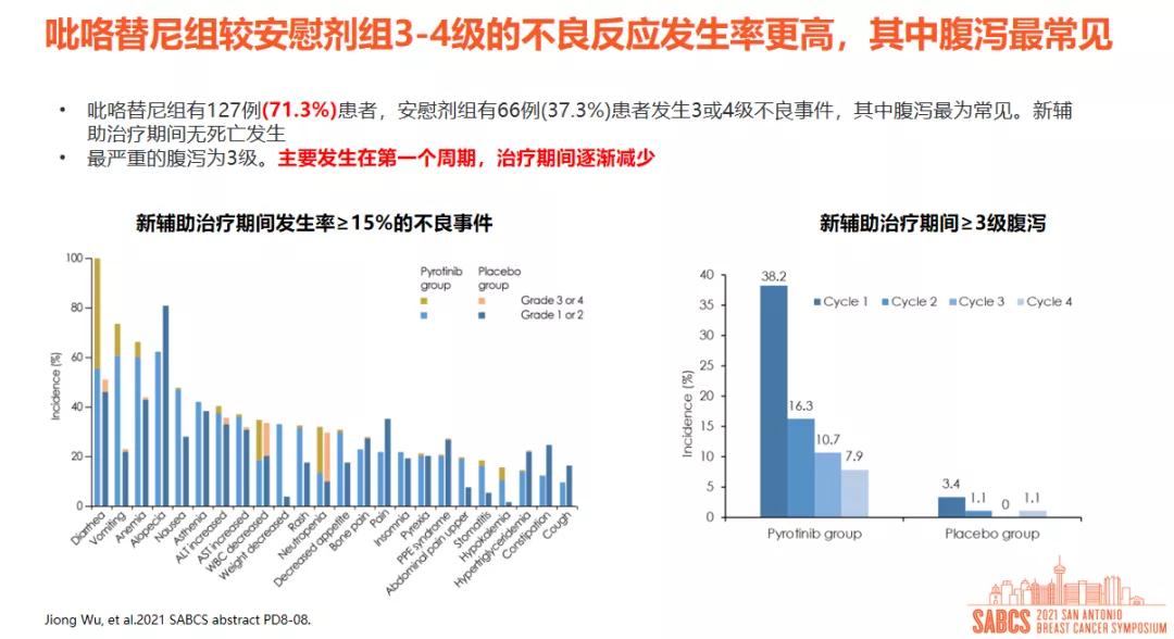 吡咯替尼组和安慰剂组的≥3级AE发生率分别为71.3%和37.3%,严重AE发生率分别为14.6%和6.8%。吡咯替尼组最常见≥3级AE为腹泻(44.4%)、白细胞计数降低(16.3%)、呕吐(12.9%)、贫血(6.2%)、贫血(5.1%)等。3级腹泻主要发生在第一个治疗周期,第二个治疗周期后有所下降。未发生4或5级腹泻。吡咯替尼组有1例(0.6%)因腹泻停药。