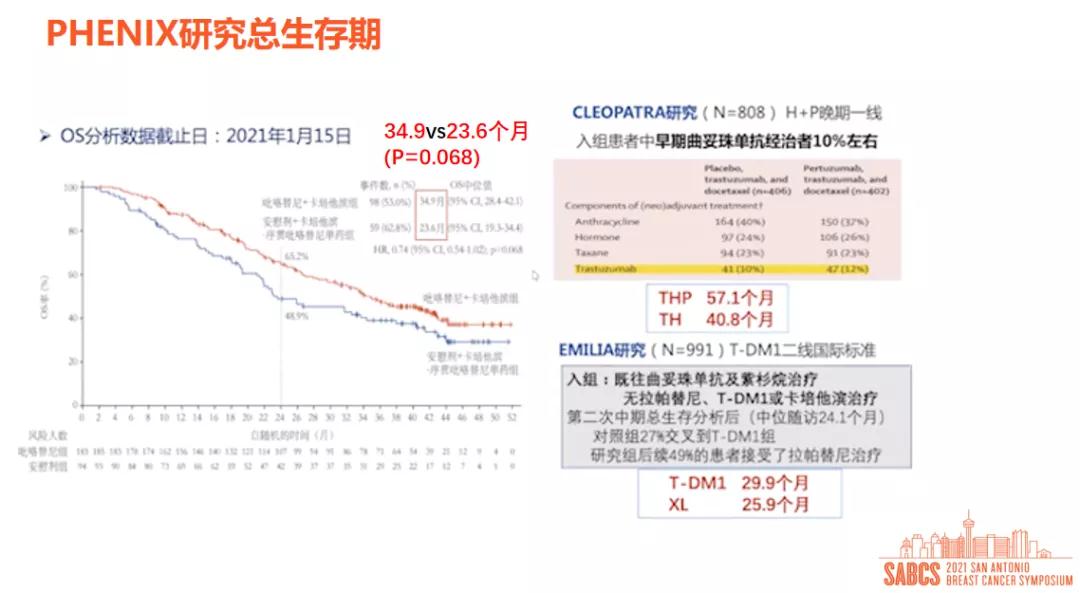 本次SABCS大会报告了该研究的OS数据。至数据截止日期2021年1月15日,安慰剂组中有94例患者序贯至吡咯替尼单药治疗。吡咯替尼组和安慰剂组的中位OS分别为34.9个月和23.6个月(HR 0.74,95%CI:0.54~1.02,P=0.068)。