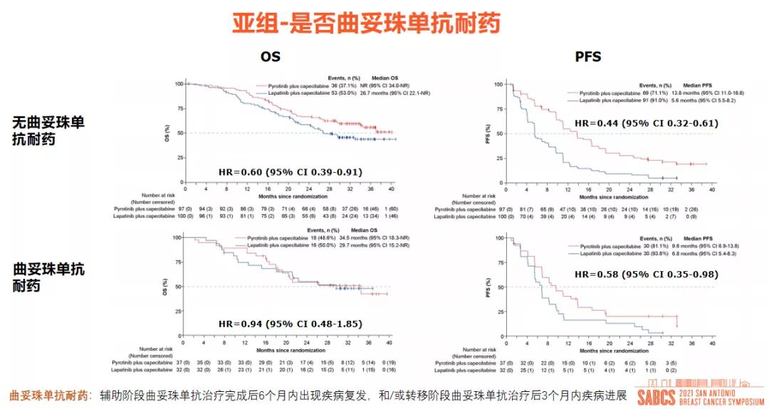 本次SABCS大会报告了该研究的OS数据。至数据截止日期2021年3月31日,吡咯替尼组和拉帕替尼组的中位OS分别为NA和26.9个月(HR 0.69,95%CI:0.48~0.98,P=0.02),2年OS率分别为66.6%和58.8%。亚组分析显示各亚组的获益趋势一致。但无曲妥珠单抗耐药(HR 0.60)患者获益更显著,而既往0线(HR 0.72)、1线(0.73)、2线(0.56)治疗患者的获益趋势一致。