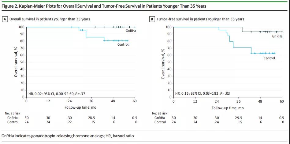 中位随访49个月(范围25-60个月),两组之间4年OS率和TFS率的差异不显著。但事后分析显示,在年龄小于35岁的患者中,GnRHa组的TFS率高于对照组(93% vs 62%;P=0.004;HR 0.15;95%CI:0.03~0.82;P=0.03)。