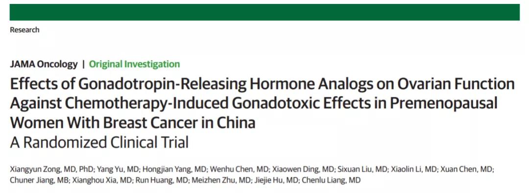 [1]Zong X, Yu Y, Yang H, et al. Effects of Gonadotropin-Releasing Hormone Analogs on Ovarian Function Against Chemotherapy-Induced Gonadotoxic Effects in Premenopausal Women With Breast Cancer in China: A Randomized Clinical Trial [published online ahead of print, 2021 Dec 30]. JAMA Oncol. 2021;10.1001/jamaoncol.2021.6214. doi:10.1001/jamaoncol.2021.6214