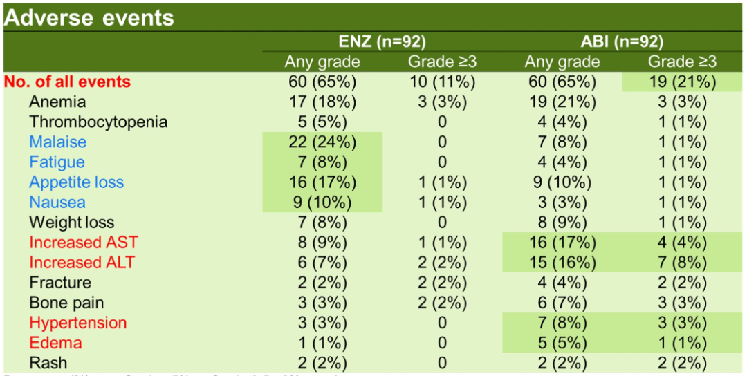 该结果显示:相较于阿比特龙组,恩扎卢胺组的至PSA进展时间延长了近10个月(21.2 vs 11.9个月;HR 0.81,95%CI:0.51~1.27,P=0.1732),PSA应答率有显著提高(72% vs 57%,P=0.0425);两组的中位OS(32.9和35.5个月)和rPFS(17.6 vs 14.0个月)没有显著差异;但是恩扎卢胺组在安全性方面表现更好,≥3级AE发生率比阿比特龙组更低(11% vs 21%)。该研究表明,尽管阿比特龙和恩扎卢胺在生存获益方面无显著差异,但在PSA缓解率、安全性等方面恩扎卢胺表现更加优异,支持在亚洲人群中将恩扎卢胺用于阿比特龙之前。