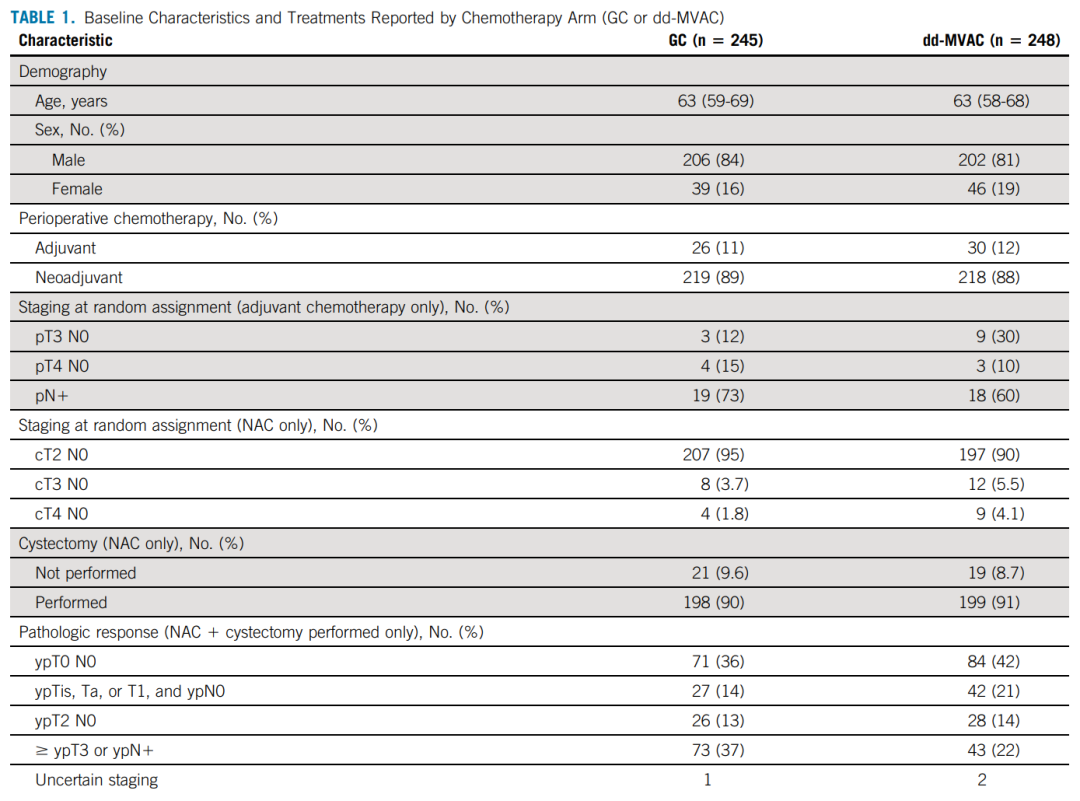 ITT人群共有493例进入分析,其中GC组245例,ddMVAC组248例。基线特征如表1所示。