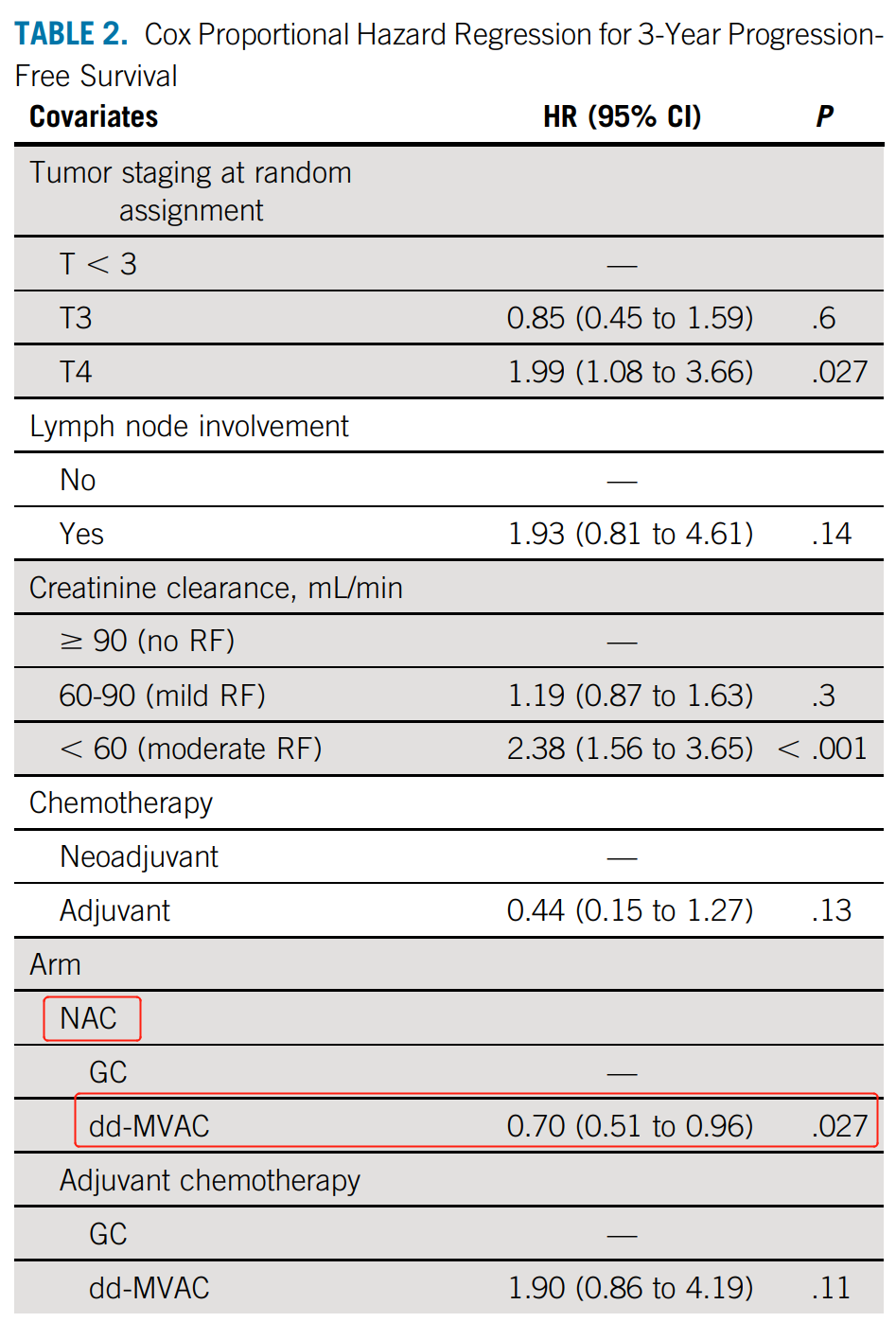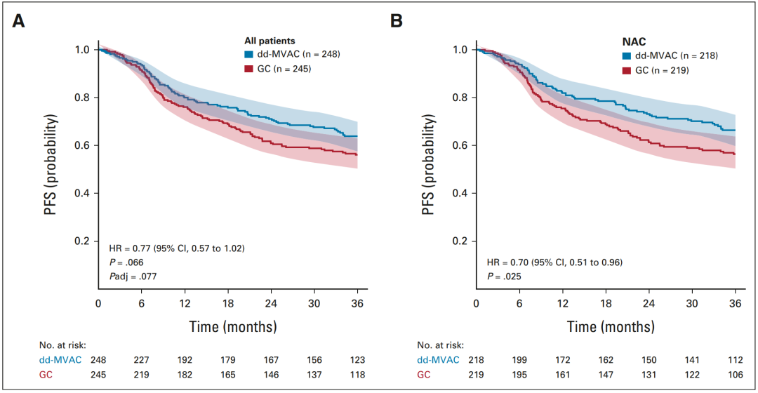 研究人员对3年PFS率的Cox比例风险回归分析发现,如果仅从新辅助治疗(n=437)来看,dd-MVAC组的疾病进展或死亡风险可显著降低30%(HR 0.70,95%CI:0.51~0.96,P=0.027),3年PFS率分别为66%和56%(表2,图2B)。