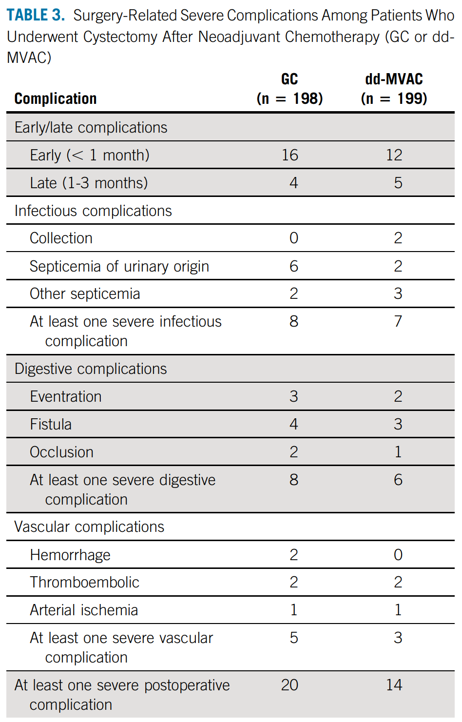 研究人员还分析了新辅助治疗后接受膀胱切除术患者的手术相关严重并发症。在28名患者中观察到早期(第一个月)并发症(其中GC组16例)。相比之下,只有9例发生延迟(1-3个月)并发症(其中GC组4例)(表3)。手术相关的严重并发症分为三类:感染、消化道并发症、血管并发症。总体上,GC组(n=20)的术后严重并发症比dd-MVAC组(n=14)更常见