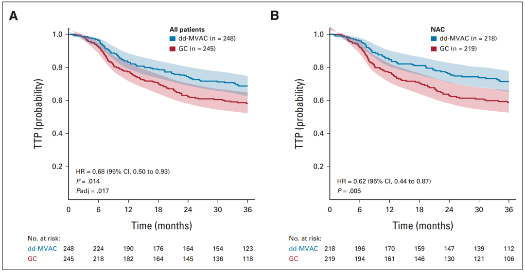 在所有患者中,dd-MVAC组的TTP显著延长(69% vs 58%,HR 0.68,95%CI:0.50~0.93,P=0.014;图3A)。在新辅助治疗患者中,dd-MVAC组的3年TTP率同样显著更高(71%vs 59%,HR 0.62,95%CI:0.44~0.85],P=0.005;图3B)。在最初3年的随访中,165例患者观察到进展,GC组和dd-MVAC组分别有96例(64%)和69例(67%),其中骨转移44例(27%),肺转移33例(20%),肝转移33例(20%)。