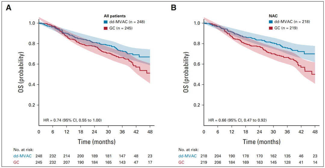 研究计划在5年随访后进行OS分析。根据目前中位随访40个月的数据来看,ddMVAC组患者有OS获益趋势(HR 0.74,95%CI:0.55~1.00;图4A),其中新辅助治疗患者中ddMVAC组的死亡风险则可降低34%(HR 0.66,95%CI:0.47~0.92;图4B)。