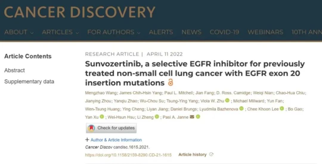 近日,我国自主研发的、靶向EGFR 20号外显子插入突变的“Ⅰ类新药”--舒沃替尼研究成果,被肿瘤领域SCI影响因子全球前十大国际顶尖期刊Cancer Discovery(IF 39.397)收录!