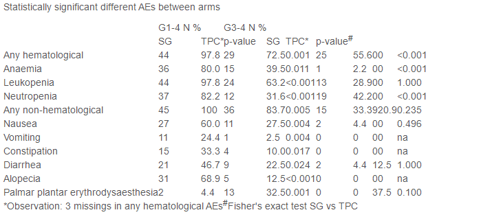 在前50名随机患者完成4个治疗周期后进行中期分析。接受≥2周期治疗,观察≥6周或更早终止治疗,纳入安全性分析。研究目的是评估不良事件(AE)分级(G) 1-4、严重AE G3-4和两组的依从性(剂量减少、延迟、停药)。