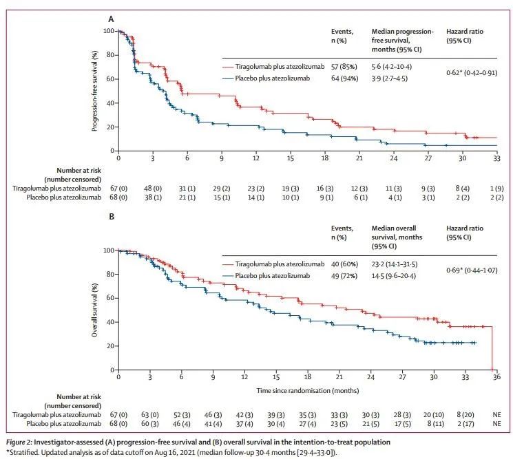 研究方法:这是一项II期、国际多中心、随机、双盲、安慰剂对照的临床研究,纳入初治PD-L1≥1%的非小细胞肺癌患者,年龄18周岁以上,携带EGFR基因突变的患者排除入组。研究允许无症状脑转移的患者入组。符合入组标准的患者按照1:1的比例,随机分为阿替利珠单抗1200 mg联合Tiragolumab 600 mg,每3周一次治疗,或单纯阿替利珠单抗治疗。研究基于PD-L1的表达水平、组织病理类型及既往吸烟状态进行分层。研究不允许交叉。PD-L1基于22C3抗体进行,主要研究终点为ORR和PFS,次要研究终点为安全性、耐受性、响应持续时间及OS。