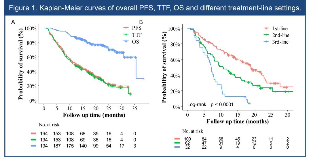 截至观察终点,中位随访时间为22.4个月,共138例患者退出哌柏西利联合内分泌治疗,退出原因包括疾病进展(130例)、经济无法承担(5例)、不良反应无法耐受(4例)。总体人群中位PFS为12.3月,中位TTF为11.8月,中位OS为35.5月(图1A)。1年PFS率、TTF率、OS率分别为50.8%、49.0% 和87.6%。一线内分泌治疗展示出相较于二线、三线及以上更长的PFS获益(p<0.001,图1B)。在具有可测量病灶的155例患者中,客观缓解率ORR为27.1%、临床获益率CBR为71.6%,疾病控制率DCR为81.3%。