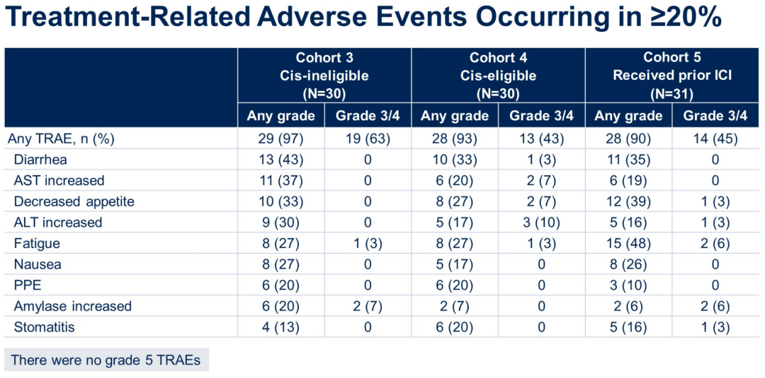 C+A在所有队列中均显示出临床获益(下表)。C3、C4和C5中任何级别的最常见治疗相关不良事件(TRAE)分别为腹泻(43%、33%、35%)、恶心(27%、17%、26%)、疲劳(27%、27%、48%)和食欲下降(33%、27%、39%);3/4级TRAE发生率分别为63%、43%和45%,无5级TRAE。