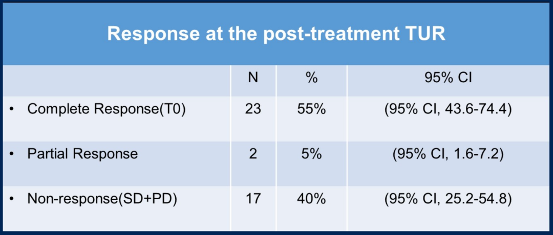 对于多发性或侵袭面积较大且不能通过TURBT完全切除的肿瘤,临床上建议行根治性膀胱切除术。KEYNOTE-057研究表明单独免疫治疗高危NMIBC患者的有效性,但抗PD-1/PD-L1联合化疗在NMIBC患者中的作用尚不清楚。II期TRUCE-02研究入组了55例TURBT不能完全切除的NMIBC患者,在第1天接受200mg替雷利珠单抗,第2天接受200mg紫杉醇,Q3W,共3或4个周期;然后进行包括病理学、尿细胞学和影像学、PD-L1表达、全转录RNA测序等综合评估。主要终点是完全缓解(CR,无非肌层浸润性膀胱癌或进展性疾病)。