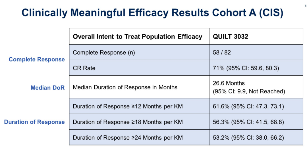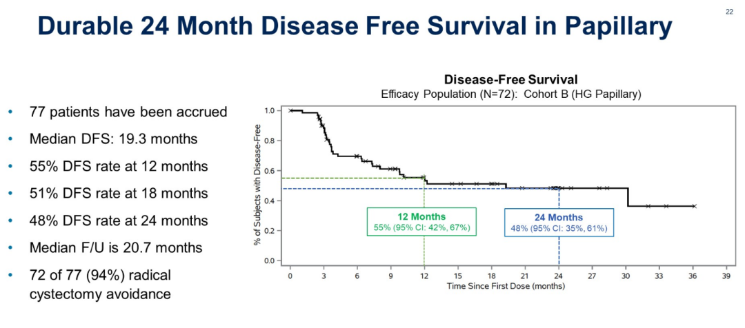 入组的160例患者中有83例CIS,77例乳头状。中位年龄为72.3岁,81%为男性,既往TURBT的平均次数为4。既往卡介苗灌注的中位次数为12。CIS患者的CR率为71%(59/83),缓解期为24.1个月;91%的患者避免了膀胱切除术,24个月无膀胱癌特异性进展生存率(定义为进展至MIBC)为96%。乳头状肿瘤患者12个月DFS率57%,24个月DFS率为48%,95%的患者避免了膀胱切除术。获得缓解者(N=4)的中位至膀胱切除术时间为12.9个月,相较于未缓解者(N=8)的7.8个月延长了5.1个月。