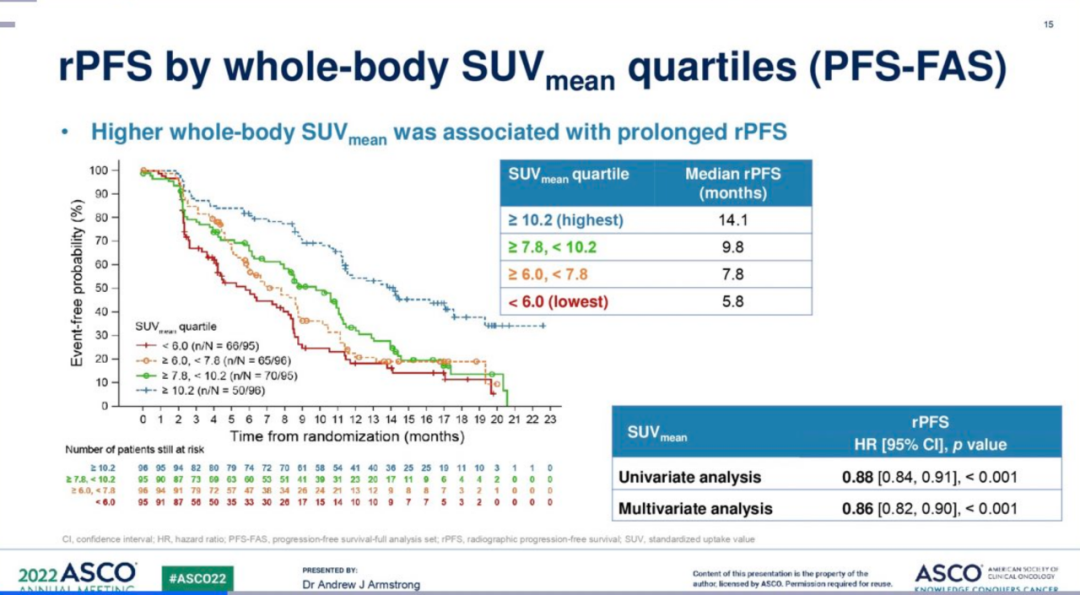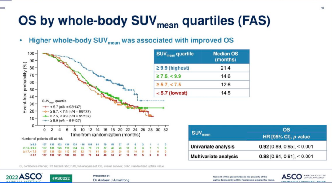 Dr.Hofman:是的,这次ASCO大会上还报告了一项非常有意思的VISION子研究,将PSMA PET基线成像为一种预后标记物。他们将PSMA平均摄取强度(SUVmean)按照四分位数进行分层,结果发现与SUVmean低四分位数相比,高四分位数患者的rPFS(5.8 vs 14.1个月)和OS(14.5 vs 21.4个月)更好。