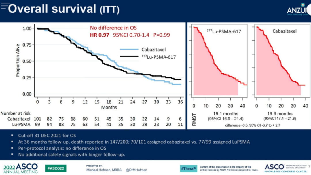 首先,虽然LuPSMA和卡巴他赛两组患者的OS无显著差异(19.1 vs 19.6个月),但需知这是一项II期研究,并非以OS为主要终点来设计,此前的中期分析已经报道达到了rPFS主要终点,而LuPSMA的OS获益在III期VISION研究(对比标准疗法,主要为ARPI)中已经得到证实。TheraP研究中后续治疗也是非常积极的,其中一部分交叉LuPSMA治疗的患者仍然是归入意向性治疗分析,这些都会影响最终的OS结果。