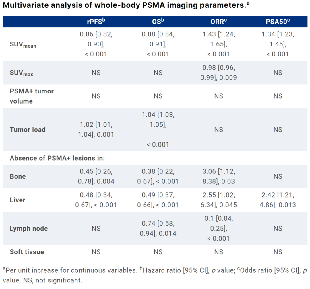 结果:大多数患者(92.7%)在骨中有PSMA摄取。在全身和区域分析中,观察到PSMA PET参数与临床结局的显著相关性(全身数据如表所示)。较高的全身SUVmean与临床结局改善相关;SUVmean最高四分位数患者的中位rPFS和OS分别为14.1和21.4个月,而SUVmean最低四分位数的rPFS和OS中位数分别为5.8和14.5个月。骨、肝和淋巴结无PSMA阳性病变、PSMA阳性肿瘤负荷较低是预后良好的指标。