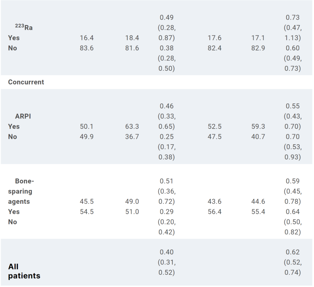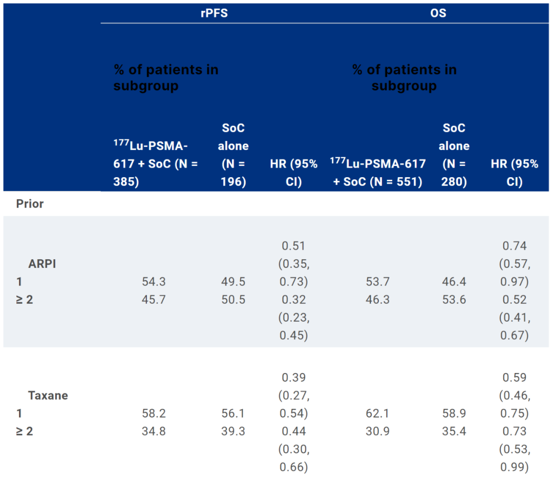 方法:VISION研究入组患者为既往接受过至少1种雄激素受体通路抑制剂(ARPI)和1-2种紫杉类治疗的成年患者,随机(2:1)分配至177Lu-PSMA-617(7.4 GBq Q6W,最多6个周期)+SoC或单独SoC。SoC不包括细胞毒性化疗、全身放射性同位素、免疫治疗或其他研究药物。rPFS和OS的探索性亚组分析由以下因素进行:既往ARPI的治疗线数;紫杉类方案;非紫杉类方案和免疫疗法;治疗前使用保骨剂;223Ra和PARP抑制剂;同时使用ARPI、放射治疗和骨保护剂进行治疗。