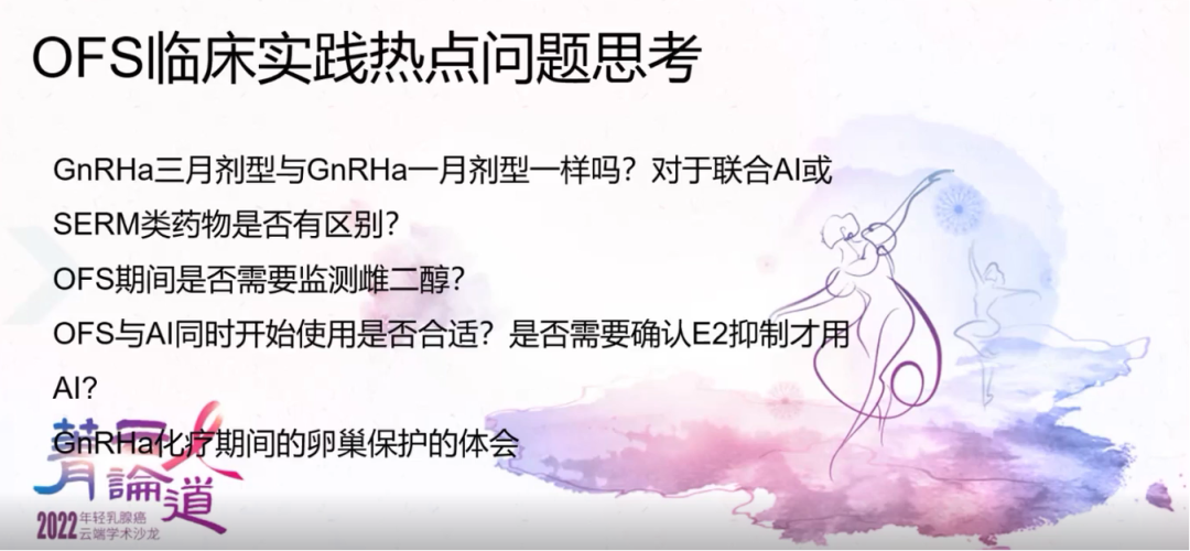 对OFS及联合治疗方案的选择,研究数据和临床经验均提示GnRHa三月剂型和一月剂型疗效相似,三月剂型可以减少患者就诊次数和成本,尤其是在疫情防控的大环境下,给患者提供了许多便利。选择联合AI或SERM时,需要权衡获益与风险,考虑到AI在大型临床试验中显著提升总生存率,OFS 联合 AI 仍应是中高危患者的首选方案,使用过程中注意骨折等不良反应的管理,能够给患者带来进一步获益。OFS治疗期间是否监测雌二醇这一问题,国内专家并未形成统一意见,支持观点主要认为在GnRHa应用早期和联用AI类药物时,检测雌激素以反映卵巢逃逸情况,但国内指南、共识均认为不需要规律监测雌二醇,一方面雌二醇检测无统一方法及标准,另一方面,检测雌二醇并不能实际改变临床路径,卵巢功能抑制不全与患者预后之间并无明确相关性,也无证据表明调整药物能够带来患者获益。关于加用AI的时机,研究数据表明GnRHa能够快速抑制卵巢功能,在2-3周内将雌激素降至绝经后水平,结合RCT研究中加用AI的时机,国内共识推荐对于未绝经的乳腺癌患者,GnRHa可以与AI同时启用。但也有许多专家认为需在开始GnRHa治疗并确认卵巢抑制后,才可以开始AI治疗,以尽可能避免AI刺激下丘脑垂体通路进而导致雌二醇水平升高,尤其对于少部分卵巢抑制逃逸患者,过早使用AI可能有不良作用。