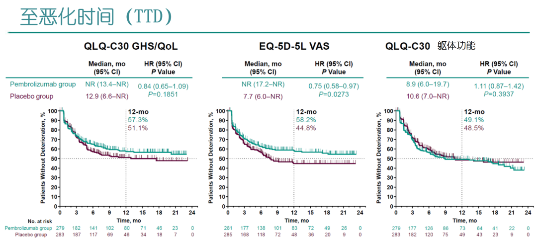 2022年SGO大会报道的该研究的患者报告结局(PRO)显示[3],帕博利珠单抗联合组患者QLQ-C30 GHS/QoL评分恶化风险有一定程度的改善趋势(至恶化时间/TTD:HR=0.84,95%CI:0.65~1.09;P=0.1851),其中躯体功能评分(HR=1.11)没有改善。然而,帕博利珠单抗联合组患者的EQ-5D VAS评分恶化风险有显著降低(HR=0.75,95%CI:0.58~0.97;P=0.0273)。