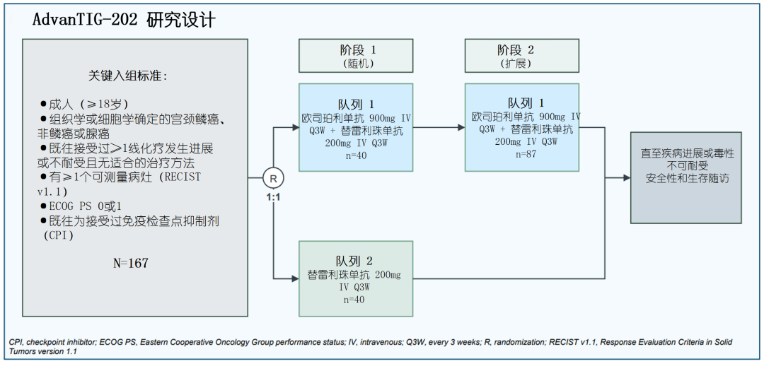 吴令英教授则在2022年SGO大会上汇报了一项正在进行中的Ⅱ期AdvanTIG-202研究[14]。该研究采用的则是TIGIT单抗欧司珀利单抗(Ociperlimab),TIGIT同样是免疫细胞上表达的一种抑制性受体。这项国际多中心研究拟入组167例一线化疗后进展的晚期宫颈癌患者,队列1给予欧司珀利单抗+替雷利珠单抗(其中一阶段患者PD-L1为回顾性检测;二阶段患者PD-L1为前瞻性检测);队列2患者给予单药替雷利珠单抗治疗。研究的主要终点是队列1的ORR(包括PD-L1 TPS≥5%以及无论PD-L1状态)。