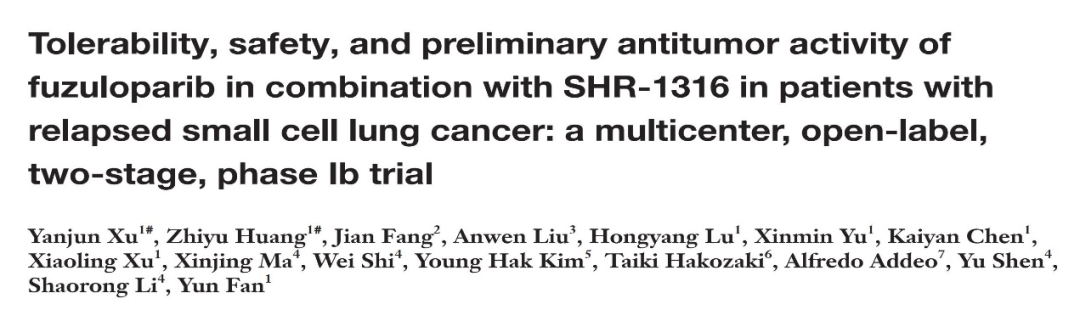 研究背景:广泛期小细胞肺癌的二线治疗选择十分有限,临床前研究显示,氟唑帕利可上调PD-L1的表达,因此可提高免疫检查点抑制剂的疗效。这项研究旨在探索氟唑帕利——一款针对PARP的抑制剂,联合SHR-1316——一款针对PD-L1的抑制剂,在复发性小细胞肺癌的疗效及安全性。