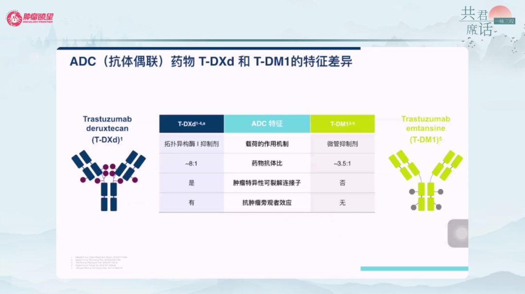 我国超过25%的乳腺癌患者为HER2阳性,其中约78%的患者将接受二线治疗。近十年来,小分子酪氨酸激酶抑制剂(TKI)、传统抗体偶联药物(ADC)等二线治疗并未带来明显突破,无进展生存期(PFS)仅1年左右。新一代靶向HER2的ADC药物T-DXd(DS8201)带来了新的希望,其由可裂解的四肽连接子将人源化HER2 IgG1单克隆抗体与拓扑异构酶Ⅰ抑制剂DXd结合,药物抗体比(DAR)为8:1,具备“旁观者效应”,从而使之在HER2阳性乳腺癌二线治疗、HER2低表达乳腺癌中发挥了显著的作用。