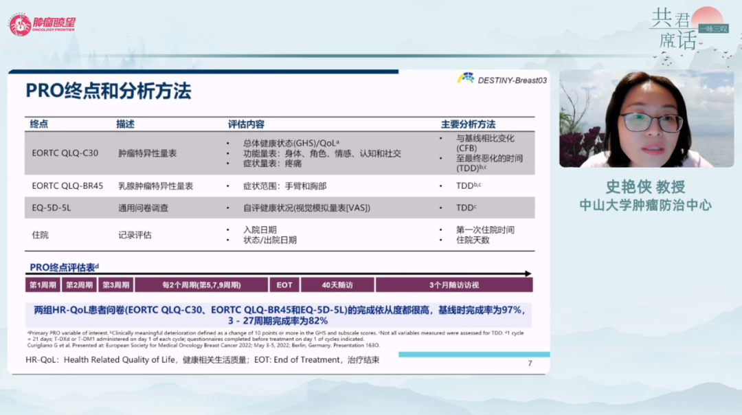 DESTINY-Breast03研究探索了患者报告的结局(PRO),该研究在第1、2、3周期、后续每2周期、治疗结束时(EOT)、治疗结束后40天、3个月分别请患者填写健康相关生活质量问卷(HR-QoL),包括肿瘤特异性量表(EORTC QLQ-C30)、乳腺肿瘤特异性量表(EORTC QLQ-BR45)、通用问卷调查(EQ-5D-5L)和住院记录评估。