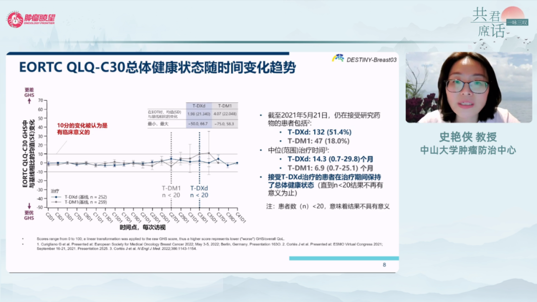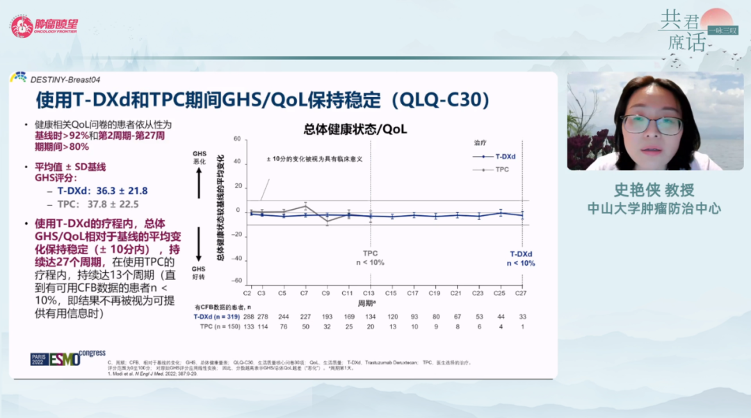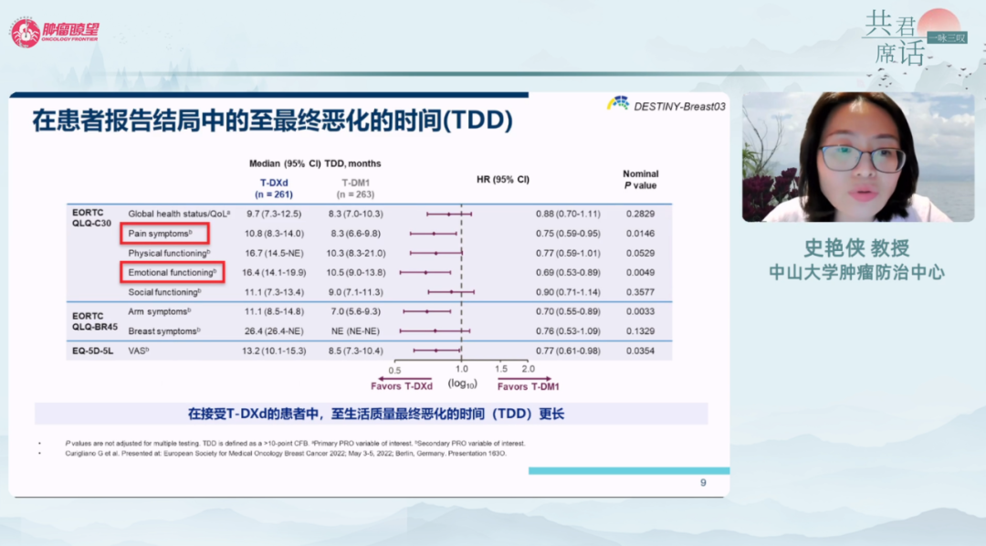 俞洋教授:DESTINY-Breast03、04研究的PRO数据告诉我们,T-DXd对患者的生活质量影响相对较低,且生存数据较好。因此在临床实践中,若不考虑经济负担及可及性问题,我一定推荐患者使用,以追求更长的生存时间和更好的生活质量。