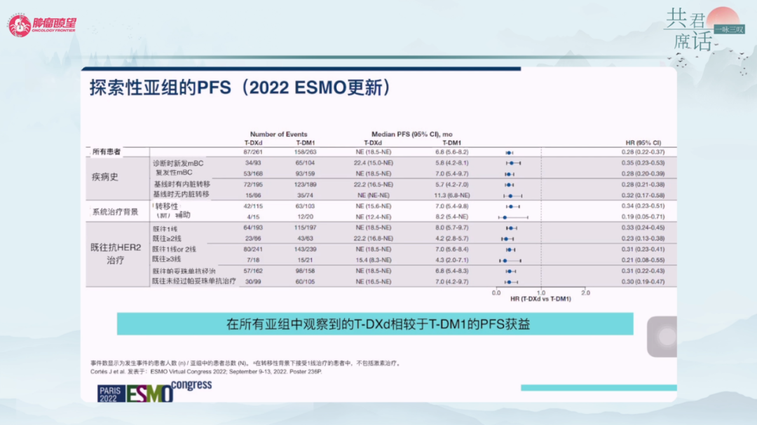 2022年ESMO对该研究不同既往病史和治疗史亚组分析数据予以公布,显示无论前序经过几线治疗、是否进行了帕妥珠单抗抗HER2治疗、无论疾病史如何(在初次诊断时有新发和复发性mBC的患者以及基线时有和无内脏疾病的患者中),所有亚组中T-DXd较T-DM1均能取得明显的PFS获益。无论是初治还是复发的患者,T-DXd组ORR均在79%以上,表现优异。