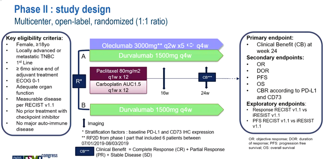 研究共纳入127例符合标准的患者。入组患者按照1∶1随机分组,在12周内接受紫杉醇和卡铂化疗,同时接受抗CD73的Oleclumab和抗PD-L1的Durvalumab单抗进行治疗。A组(63例):Oleclumab+度伐利尤单抗+紫杉醇+卡铂,B组(64例):度伐利尤单抗+紫杉醇+卡铂。在12周的免疫治疗后,患者继续接受免疫治疗,主要研究终点是第24周的临床获益率(CBR)。次要终点包括客观缓解率(ORR)、持续缓解时间(DOR)、无进展生存期(PFS)、总生存(OS),根据不同PD-L1和CD73表达水平的CBR等。