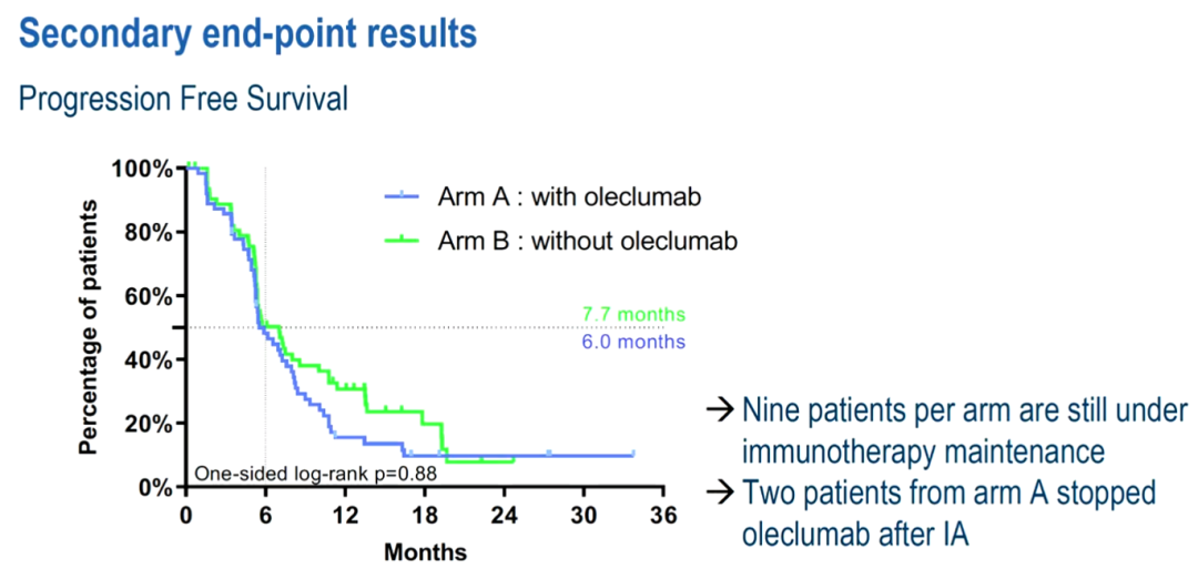 In the SYNERGY trial,we combined this chemo-immunotherapy with an adenosine targeting agent,oleclumab.This is a monoclonal antibody directed against CD73.CD73 is responsible for the generation of immunosuppressive adenosine in the tumor microenvironment.So the combination of a PD-1/PD-L1 immune checkpoint blocker and this adenosine targeting agent is aimed at enhancing the immune response.Patients were randomized to chemotherapy with paclitaxel and carboplatin received over 12 weeks,and oleclumab,the anti-CD73,with durvalumab,an anti-PD-L1.And in the other arm,patients received the same chemotherapy,but with durvalumab alone.After the 12 weeks of immunotherapy,patients continued with immunotherapy maintenance.The primary endpoint was the clinical benefit at week 24.The trial didn’t show a difference in clinical benefit between the two arms,showing 43%CBR in Arm A with the double immunotherapy,and 44%in Arm B with durvalumab alone.