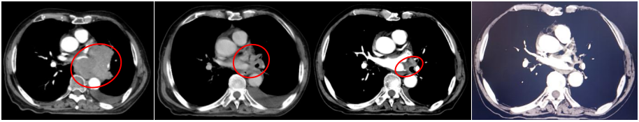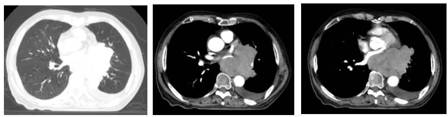 2022-11-21(6周期后)胸部、全腹部增强CT:左肺门占位较前(2022-09-30)减小,左肺下叶远端阻塞性改变较前变化不大;左侧胸腔积液,累及左侧胸膜可能,较前减少;心包少量积液,大致同前。