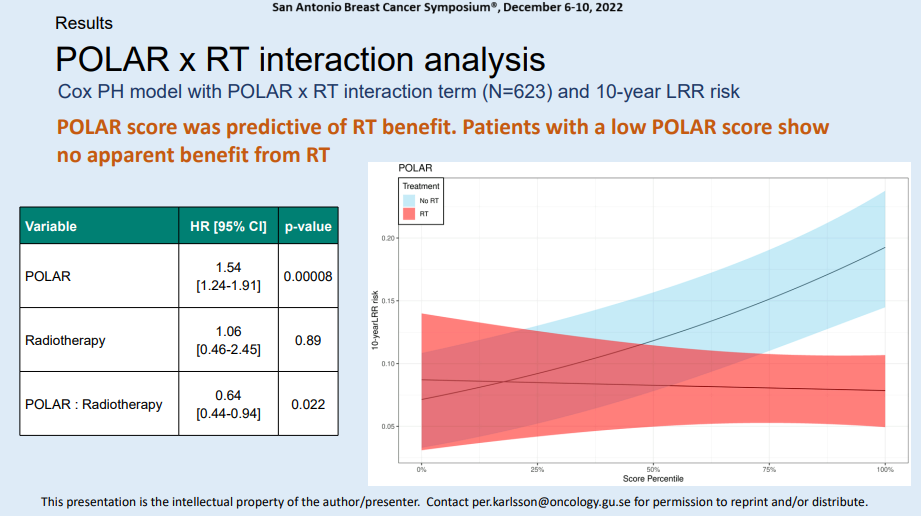 POLAR是第一个基因组分类器,它不仅可以预测LRR,还可以预测RT和分类器之间存在显著的相互作用。POLAR评分高的患者应推荐放疗,而低评分的患者则推荐保乳手术后豁免放疗。