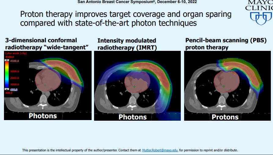 质子放疗具有出色的局部区域控制和正常组织保护能力。亚临床超声心动图变化未表明辐射会引起心功能不全。大分割与传统分割具有相似的疾病控制、耐受性和重建结果。虽然不能根据并发症发生率大于10%的95%置信区间上限确定大分割的非劣效性,但常规和大分割方案均可被认为是正在进行的比较光子和质子放疗的Ⅲ期随机试验的合适方案。