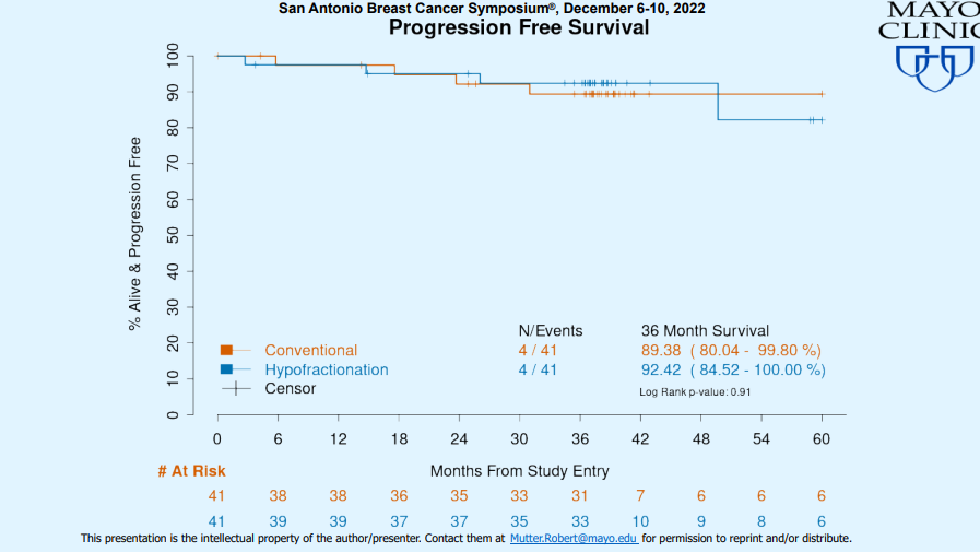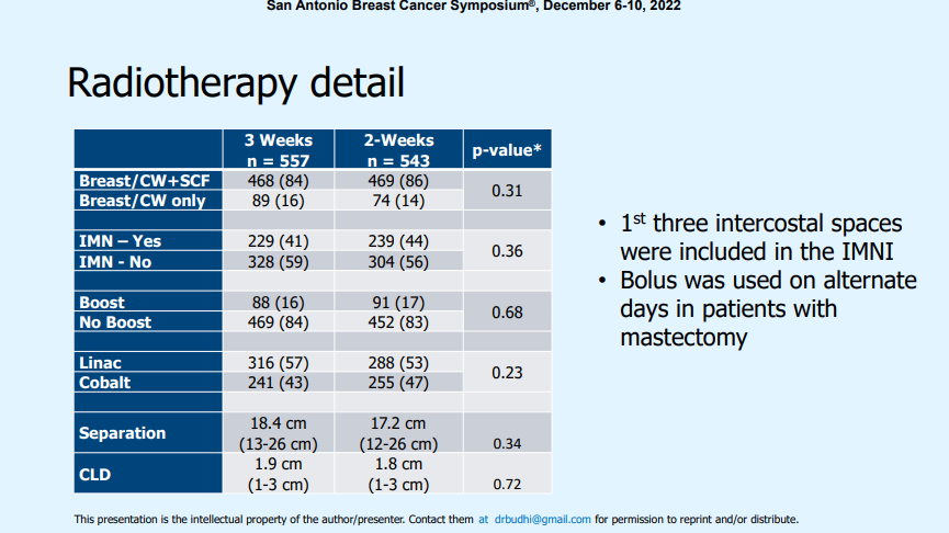 第二个研究是SABCS 2022来自印度的乳腺癌大分割放疗,对Ⅲ期临床研究中大分割放疗的毒性反应进行研究。乳腺癌患者的分期为Ⅰ~Ⅲ期,并依据根治术后放疗或者保乳术后放疗指征随机分为两组。其中一组大分割放疗方案是目前全球应用比较多的三周方案,针对胸壁采用的是35Gy 15次,针对乳腺和锁骨上采用的是40Gy 15次;而研究组采用的是两周方案,是采用的34 Gy 10次,即每次3.4 Gy,两周完成。如果保乳术后需要加量,后续加量为4 Gy,总共两次。研究共纳入1121例患者,中位随访时间为35个月。