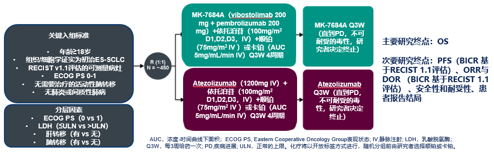 KeyVibe-0087是一项旨在评估MK-7684A(TIGIT抑制剂Vibostolimab+PD-1抑制剂帕博利珠单抗的复方制剂)联合化疗相比阿替利珠单抗联合化疗作为ES-SCLC一线治疗的疗效和安全性的Ⅲ期临床研究,该研究设计(如图6)是针对目前ES-SCLC经典的IMpower133模式的进一步升级。目前,该研究正在进行中。