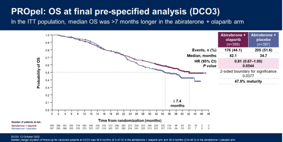 Final overall survival(OS)in PROpel:abiraterone(abi)and olaparib(ola)versus abiraterone and placebo(pbo)as first-line(1L)therapy for metastatic castration-resistant prostate cancer(mCRPC).(摘要号:LBA16)