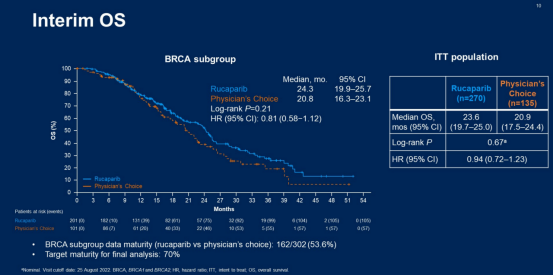 Niraparib一线治疗的3期MAGNITUDE研究,既往已经报道可显著改善HRR+和BRCA突变患者的rPFS,本次ASCO-GU大会也报道了该研究的第二次中期分析结果:在所有HRR+患者(16.7 vs 13.7个月;HR 0.76,P=0.0280)和BRCA突变患者(19.5 vs 10.9个月;HR 0.55,P=0.0007)中,rPFS仍然有改善;主要分层分析中的OS没有显著获益(HRR+和BRCA突变患者的HR分别为1.01和0.88),但在多变量分析中的OS有获益趋势(HR分别为0.82和0.68);此外,HRR+和BRCA突变患者的至症状进展时间(TSP)、至毒性化疗时间(TCC)均有显著改善。