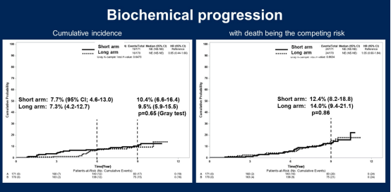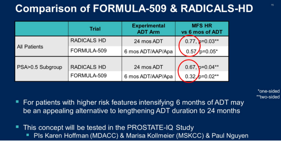 结合去年ESMO报道的RADICALS-HD研究来看,对于此类高危患者,24个月的ADT治疗获益优于6个月ADT,单独ADT仍应推荐长疗程。虽然在FORMULA-509研究总体上为阴性结果,但6个月ADT联合NHT总体人群有获益趋势,尤其是PSA>0.5的亚组患者达到显著的PFS和MFS获益,这部分患者在挽救放疗后采用6个月ADT+NHT“短程强化”的内分泌治疗方案是可行的。