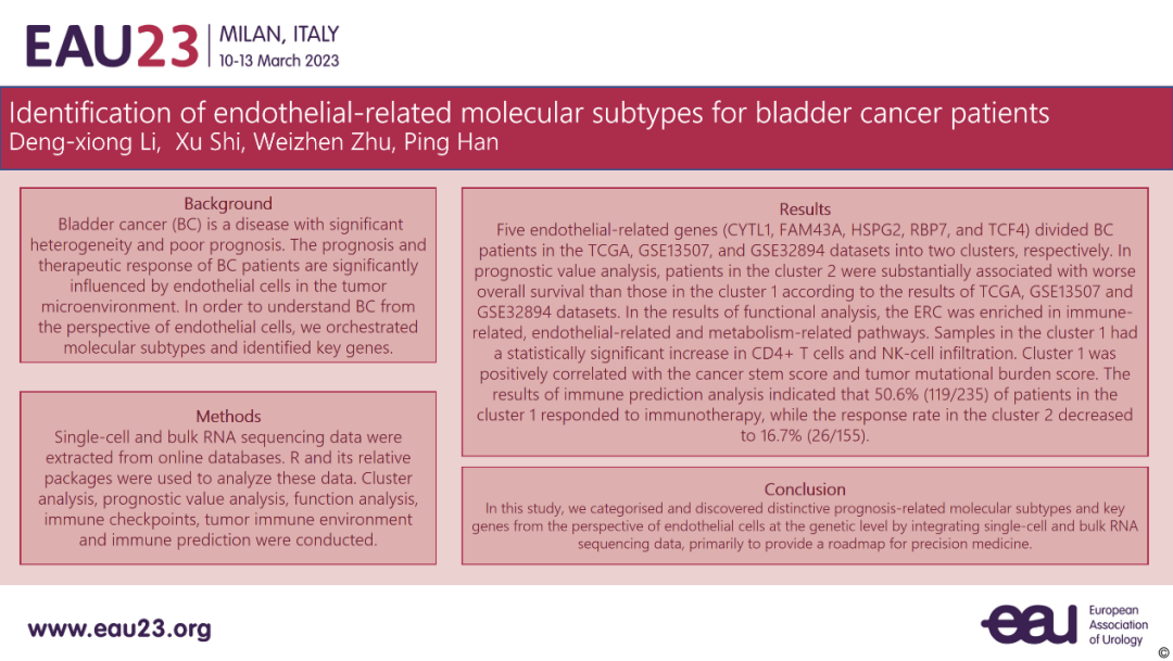 编者按:第38届欧洲泌尿外科学会年会(EAU23)于2023年3月10日至13日在世界时尚之都意大利米兰召开。EAU年会是欧洲乃至全球最受关注的泌尿外科会议之一,每年吸引全球1万5千余名泌尿外科专家参会。本次大会上,四川大学华西医院李登雄医生汇报的一项研究,通过整合单细胞和批量RNA测序数据,从内皮细胞的角度,在基因水平上分类并发现了膀胱癌患者的预后相关分子亚型和关键基因,为精准医疗提供靶点。