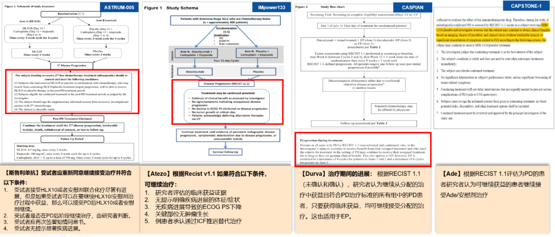 因为免疫治疗存在假性进展的可能,所以ASTRUM-005,IMpower133,CASPIAN和CAPSTONE-1研究Protocol中都有继续接受研究药物治疗的规定:即经RECIST v1.1评估PD(疾病进展),但研究者认为受试者仍可能从研究药物中获益,则继续接受研究药物治疗。