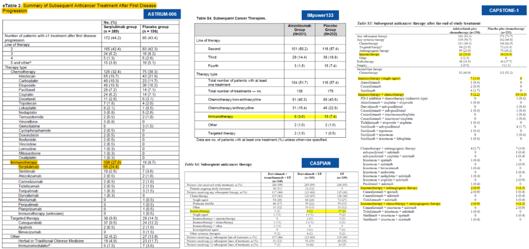显然披露的数据不同,不可以做直接的对比,而且在IMpower133、CASPIAN、CAPSTONE-1研究未公布经RECIST v1.1评估PD后继续接受研究药物治疗的情况下,讲后线治疗能够带来OS获益也是没有任何依据的,但斯鲁利单抗联合化疗为患者带来了长期生存是确切的。当然患者一线免疫联合化疗治疗进展后,继续跨线使用免疫治疗能否带来更长的获益尚还需要更多循证医学证据。