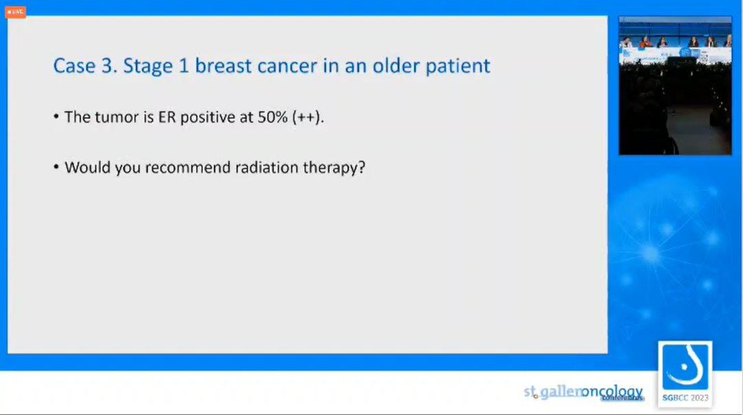 在“Interactive SessionⅡ——Too big,too small?Too low,too high?Adjuvant choices when stage and biology do not align”专场,与会专家就乳腺癌患者的早期辅助治疗问题以病例的形式进行了讨论(共12个病例,仅展示前3个)。