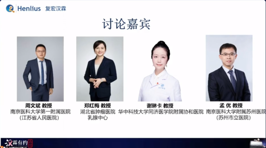四位讨论嘉宾针对3个问题展开了精彩的讨论分享。如果患者早期肿瘤在2-3cm之间,是否进行双靶辅助治疗?而如果患者较为年轻且T3,是否也采用同样方案?南京医科大学第一附属医院周文斌教授认为,肿瘤大小、淋巴结是否转移、肿瘤浸润及患者年龄都是重要的考虑内容。对于这部分患者,会优先进行新辅助治疗;如果患者达到pCR,则后续治疗方案采用单靶或双靶均可。而如果直接进行辅助治疗,则会更推荐单靶治疗。湖北省肿瘤医院郑红梅教授认为,年轻患者预期生存要求更高,因而辅助治疗中会使用双靶治疗。而如果患者在新辅助中单靶可以达到pCR,则术后继续单靶治疗;但若患者危险因素较多,建议使用标准的双靶治疗方案。