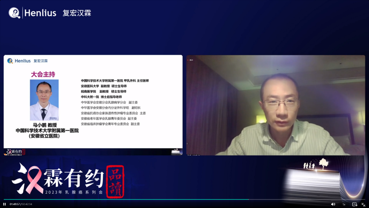 中国科学技术大学附属第一医院马小鹏教授的主持下,江苏省人民医院李薇教授分享了《SGBCC 2023早期激素受体阳性乳腺癌的治疗决策》讲课,从早期激素受体阳性乳腺癌术前内分泌治疗、辅助化疗决策、辅助内分泌治疗持续时间的选择以及阿贝西利辅助治疗的推荐原则等4个方面进行了详细介绍。李薇教授指出,HR+早期乳腺患者在5年后仍有复发风险,在选择患者进行超过5年的内分泌治疗时,应估计复发风险并预测治疗效果。同时,需要考虑年龄和合并症等竞争性风险,但也需要考虑内分泌治疗的耐受性。此外,阿贝西利对激素受体阳性HER2阴性高风险早期乳腺癌领域无浸润病变生存和无远处复发生存均有获益,且获益幅度不断提高。