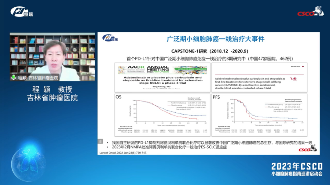 大会开篇,王绿化教授作为环节主持邀请程颖教授全面梳理2022年小细胞肺癌领域的重大事件。程颖教授强调,回首2022年,小细胞肺癌领域的首个大事件是CAPSTONE-1研究取得了瞩目成果,印证恒瑞公司自主研发的PD-L1抑制剂阿得贝利单抗在ES-SCLC一线治疗的价值。作为首个100%纳入中国人群的III期注册临床研究,CAPSTONE-1研究结果显示,阿得贝利单抗联合化疗组中位总生存期(mOS)达15.3个月,降低死亡风险达28%,中位无进展生存期(mPFS)为5.8个月,降低疾病进展风险达33%。基于出色成果,该研究在2022年美国癌症研究协会(AACR)上口头报告,并且全文发表在国际顶尖学术期刊Lancet Oncology。阿得贝利单抗于今年2月28日正式获批ES-SCLC一线治疗适应症,重塑ES-SCLC治疗格局。我国自主研发的斯鲁利单抗是目前全球唯一在小细胞肺癌领域取得阳性结果的PD-1抑制剂,也于今年年初获批相同适应症。ES-SCLC二线治疗中,芦比替丁在我国开展的桥接试验达到主要终点,基于此,其也被纳入新版指南推荐。此外,针对复发小细胞肺癌患者,靶向DLL3的双特异性T细胞连接器Tarlatamab、靶向B7H3的ADC药物也为该部分患者带来全新希望。
