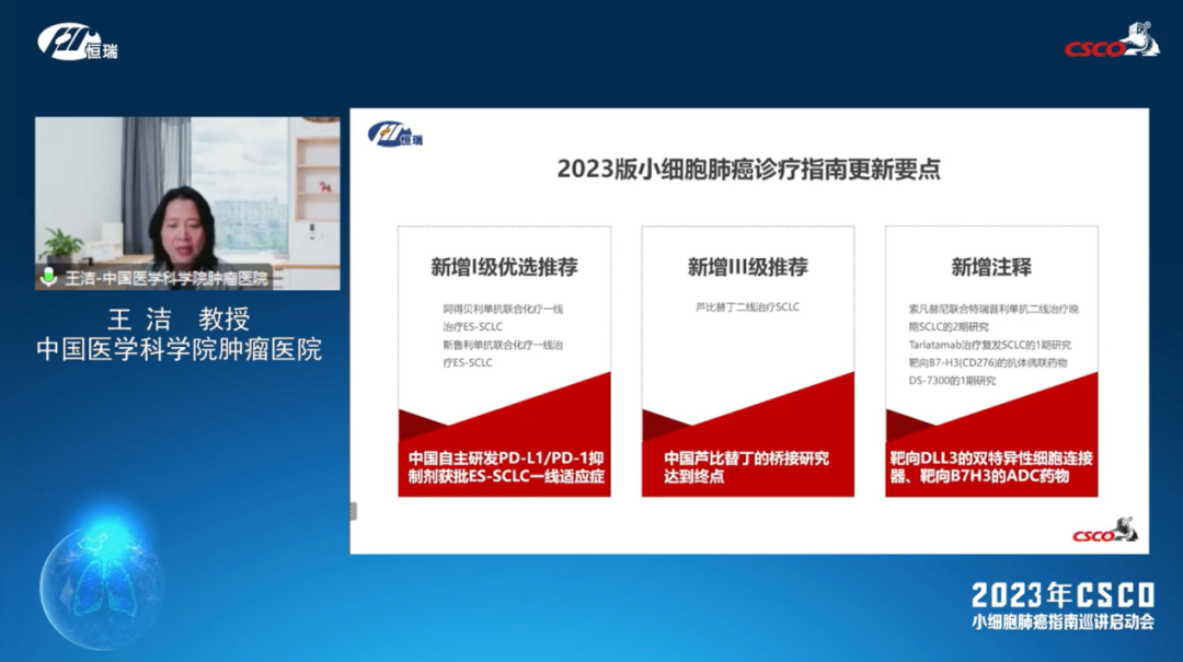 在此背景下,为进一步推动小细胞肺癌规范化诊疗的落实、传递前沿学术进展和先进治疗理念,由中国临床肿瘤学会小细胞肺癌专家委员会主办,江苏恒瑞医药有限公司协办的2023年CSCO小细胞肺癌指南巡讲启动会于2023年5月23日成功召开。本次会议特邀CSCO小细胞肺癌专委会主任委员吉林省肿瘤医院程颖教授和副主任委员中国医学科学院肿瘤医院王洁教授、中国医学科学院肿瘤医院深圳医院王绿化教授共同担任大会主席,来自全国多家医院的知名专家学者齐聚一堂,共同解读指南更新要点。立足新起点,肺跃新征程,践行指南,中国力量。以下整理会议精粹,以飨读者。