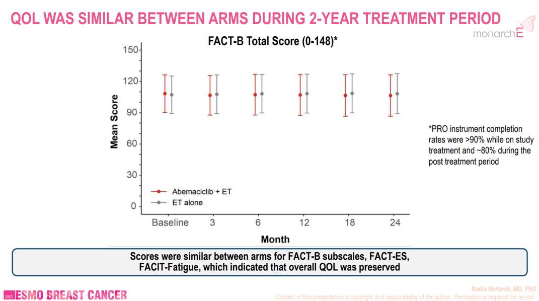 本次ESMO BC公布了Monarch E研究的患者报告结局(PRO)1。该研究通过生活质量量表FACT-B、FACT-ES和FACT-Fatigue量表评估患者PROs,结果显示除腹泻评分以外,其余组内和组间PROs无显著差异。阿贝西利联合内分泌治疗相关腹泻多发生在治疗早期,且随着治疗时间的延长,患者耐受程度逐渐增加,这一点与我们的临床实践相符。该研究结果进一步证实了在高危早期HR+/HER2-乳腺癌的强化辅助治疗中阿贝西利联合内分泌治疗的毒性是可逆的、安全可耐受。